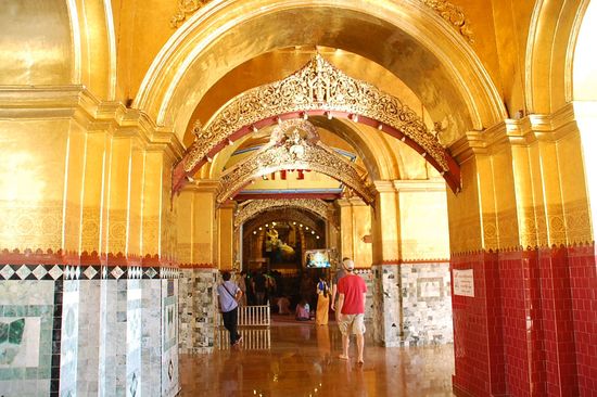 Hier wird auch wieder ganz viel Gold geklebt. Wieder nur Männer, man kann das aber auf Bildschirmen verfolgen. Wenn ein Mann die Hose zu kurz hat, muß er sich einen Longii leihen (Longii =diese "Röcke" die hier die Männer tragen), damit die Knie bedeckt sind.