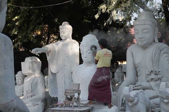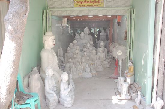 Als nächstes sind wir in die Strasse gefahren, in der die ganzen Buddha's aus den Marmorblöcken geschnitten und geschliffen werden. Hier ist Zayar gar nicht mit uns ausgestiegen es war ihm wohl zu viel Staub in der Luft....