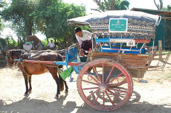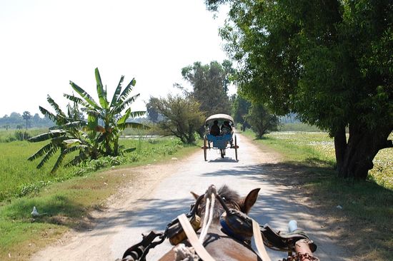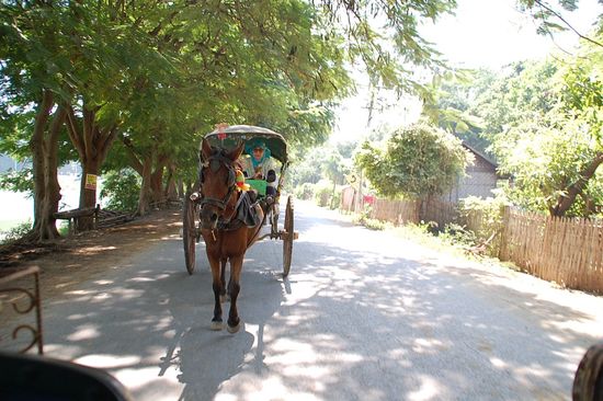 Für ein paar Kyat fährt man mit einem kleinen Boot auf die andere Flußseite und steigt dort um in eine Kutsche. In unserem Reiseführer als romantische Fahrt deklariert....wenn man unter romantisch eine Holperfahrt über Stock und Stein versteht, bei der man krampfhaft versucht sich festzuhalten und nicht gegen irgendeine Eisenstange zu knallen, d a n n ist es romantisch