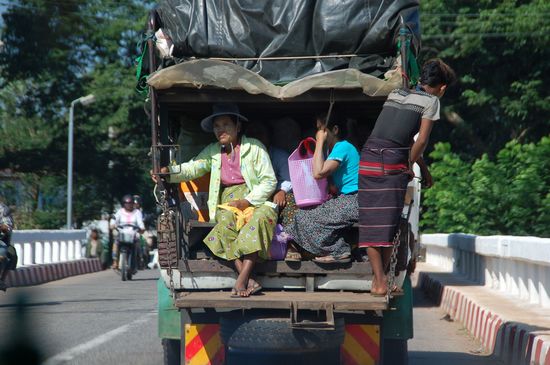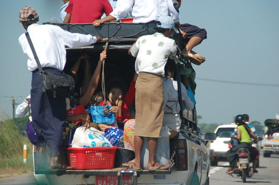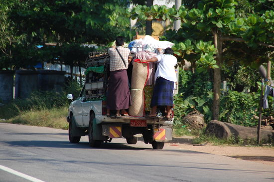 Zayar war natürlich auch pünktlich. Wir sind nun wieder die gleiche Strecke zurück, die wir gestern gekommen sind. Heute stehen schon einige Busse links und rechts der Strasse.