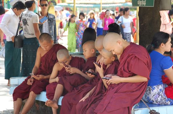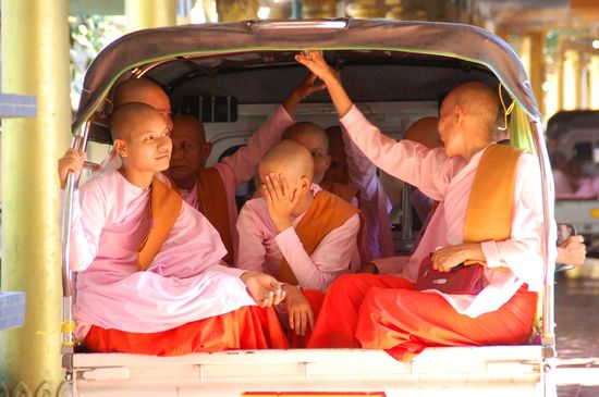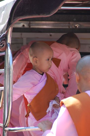 Nach 2 Stunden sind wir in Bago angekommen. Zayar wollte einen Tempel anfahren, aber dort waren so viele Menschen und Auto's, daß wir gar nicht dort hin gekommen sind. Er hat dann wieder gedreht und wir sind erstmal an eine Schule für Mönche gefahren. Hier werden männliche und weibliche Mönche ausgebildet.