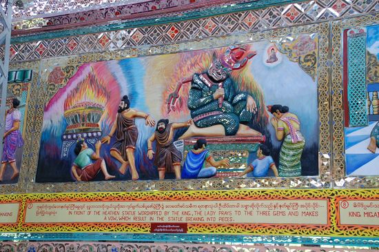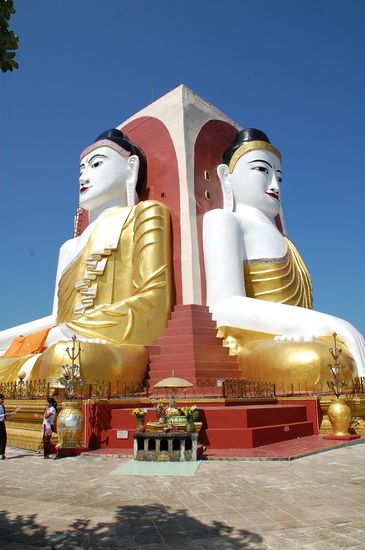 Von hier aus sind wir ein Stück aus der Stadt raus zu den 4 sitzenden Buddha's, die auf die Ankunft des fünften Buddha warten. Hier muss man 10000 Kyat bezahlen, gilt aber dann auch für zwei weitere Pagoden und den Palast. Allerdings musste ich hier auch 300 Kyat für den Fotoapparat zahlen.