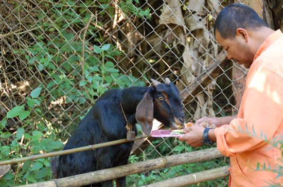 Wenn alle Gäste durch sind mit Frühstücken, bekommt der tierische Gartenbewohner, welcher hier gehalten wird, die Obstreste.