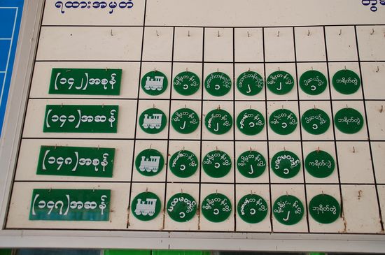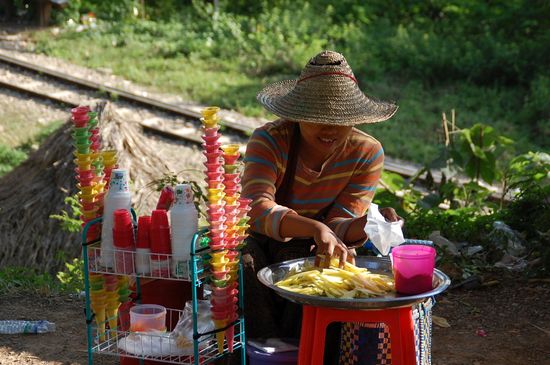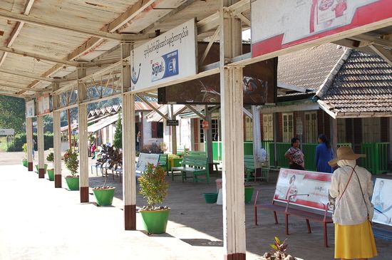 Zayar hat uns wieder pünktlich abgeholt, und wir sind erst zum kleinen Bahnhof von Kalaw gefahren. Um mit dem Zug hier hin oder von hier nach Yangon zu kommen, muss man in Thazi umsteigen.