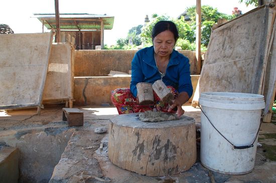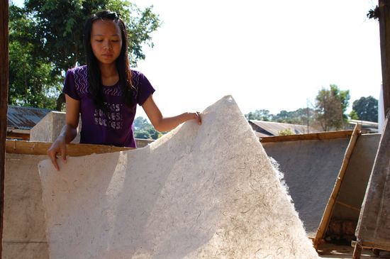 Aus einer bestimmten Baumrinde (welche weiss ich nicht mehr) wird ein "Matsch" gemacht, dieser wird dann in einem ganz feinen Sieb unter Wasser zu einem Bogen gemacht (ähnlich wie bei uns Pappmaché) und getrocknet.