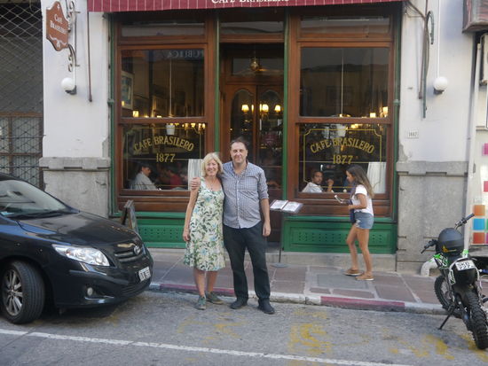 Zum Café führte uns Hector ins Café Brasilero. Zunächst fühlten wir uns wie in ein Wiener Caféhaus entführt, dann entdeckten wir an den Wänden zwischen zahlreichen eingerahmten Fotografien von berühmten Gästen des Hauses Porträts von Eduardo Galeano und Mario Benedetti.