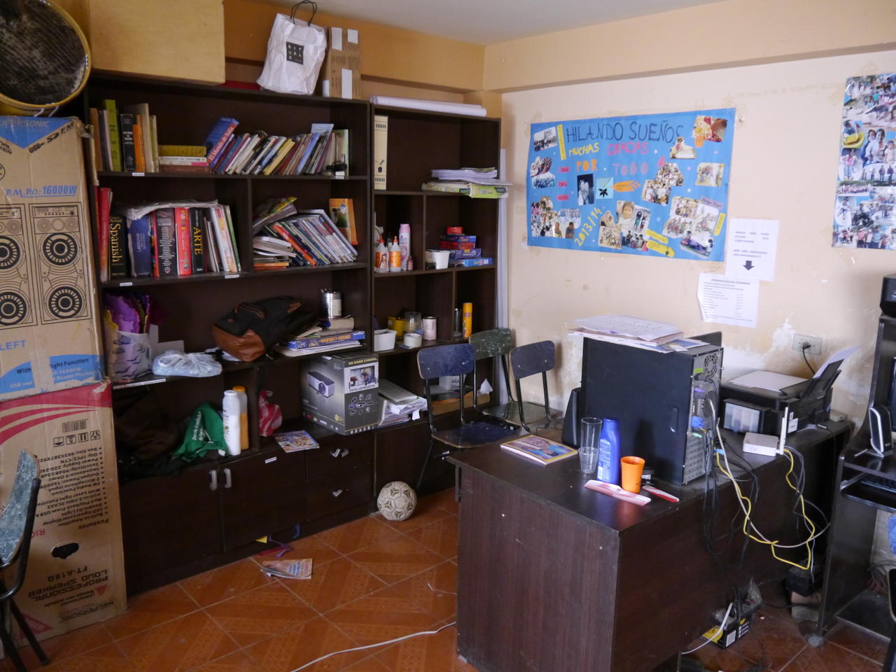 Im Hauptraum, sozusagen Büro und Unterrichtsraum 1, stehen 3 Computer und 1 Drucker zur Verfügung. In der Küche gibt es einen Kühlschrank und einen Herd. Ein Waschbecken gibt es nicht. 2 größere Wannen im Hof werden zum Spülen benutzt.