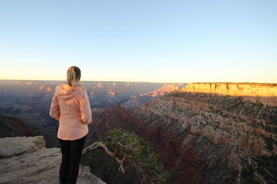 Wir passieren den Eingang zum Grand Canyon (mal wieder ein Hinweis, auch wenn die Meisten es wissen: Kauft euch für eine Rundreise auf jeden Fall direkt den ATB Pass, damit ihr nicht all die horrenden Eintrittsgelder zahlen müsst) und fahren zum Yaki Point, weil wir uns hier einen netten Sonnenuntergang ohne viele Menschen erhoffen. Es klappt ganz gut, wir sehen tatsächlich noch ein paar in Sonne getauchte Felsen ehe es dunkel wird. Die Aussicht am Canyon ist atemberaubend und schlägt fast alles, was wir bis jetzt gesehen haben. Ich bin direkt froh, dass wir morgen noch einen halben Tag hier verbringen. Wir sind uns direkt einig, dass das einfach viel mehr unser Ding ist als Städte besuchen