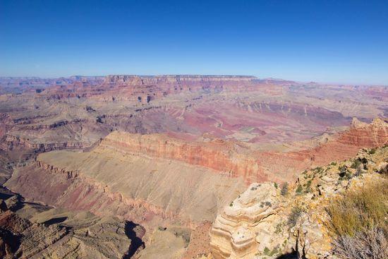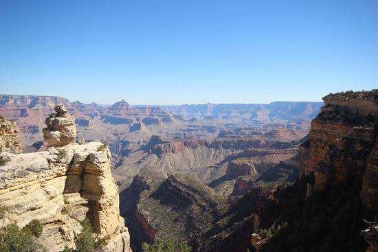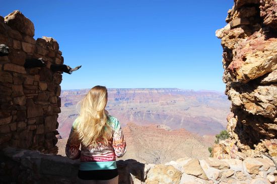 Heute sind wir wieder sehr früh auf den Beinen um den Sonnenaufgang am Grand Canyon zu beobachten. Wir schaffen es auch zeitig zum Rim und sind allein dort, aber wir haben die Temperaturen etwas unterschätzt Ganz tapfer warten wir bis es hell ist und müssen uns dann erstmal im Auto aufwärmen. Auch wenn es hier tagsüber über 20 Grad sind, fällt die Temperatur nachts gerne mal unter Null. Aber die Sonne geht schon auf und direkt wird es angenehmer. Und so fahren wir zum Mather Point und zum Bright Angel Trailhead (den wir mangels Zeit nicht laufen können) und wandern am Rim Trail entlang. Immer wieder bleiben wir stehen um die tolle Aussicht zu genießen und Fotos zu machen. Es gibt schon einen Grund wieso so viele Leute hier täglich herkommen. Der Canyon lohnt sich!