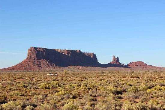 Auf dem Weg Richtung Monument Valley halten wir noch an weiteren Aussichtspunkten am Desert View Drive und setzen dann die fast 3 Stunden lange Fahrt fort. Da der Tag so früh begann wechseln wir uns immer wieder beim Fahren ab. Auf diesen elend langen Straßen durch Wüste und Gestrüpp fallen einem einfach die Augen zu. Aber es bieten sich auch immer wieder tolle Ausblicke.