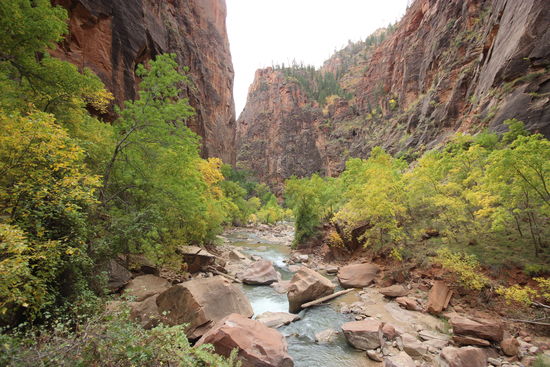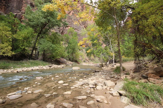 Auch wenn wir diesmal früher dran sind - no no parking space! Man muss sagen, das ist hier ein Alptraum. Soviel Platz und so wenig Parkplätze. Schon gestern haben wir ewig gesucht und wahrscheinlich muss man echt in Springdale parken und den Shuttlebus nehmen. Das ist jetzt weniger geil aber da man den Park an sich schnell abgegrast hat geht es schon. Nach 20 Minuten finden wir auch einen, der wegfährt und schnappen uns direkt den Platz. Vom Visitor Center nehmen wir den Shuttle Bus bis Temple of Sinawava und klappern von dort die einzelnen Stopps und Hikes ab. Alle sind kurz und easy zu bewältigen und daher zum weiteren Auskurieren genau richtig. Aber heute ist es bewölkt und der Virgin River ist eiskalt. Entsprechend kaaalt ist mir in meiner Shorts. Damit hab ich nicht so ganz gerechnet also lauf ich im Stechschritt, damit mir warm wird Trotzdem bekommt man ein paar tolle Einblicke in den Canyon. Und am Nachmittag kehren wir ausgehungert in der Zion Lodge ein, besorgen uns Cheeseburger und genießen die Sonne im Schaukelstuhl (jaaa nun kam sie noch noch raus und hat uns angenehme 27 Grad beschert).
