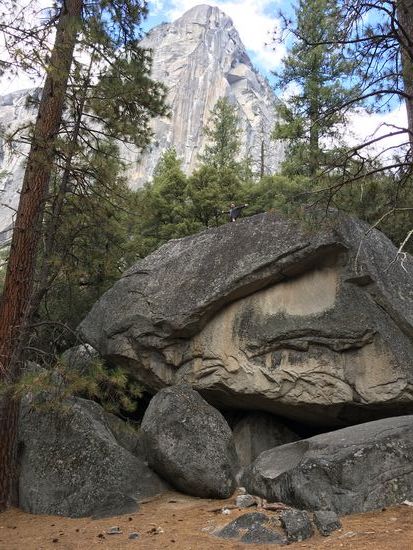 Bevor wir uns auf den Rückweg machen laufen wir noch bis zum Fuße des El Capitan, eines der Wahrzeichen des Yosemite mit einer gut 1000m hohen senkrechten Steilwand. Niemals hätte ich gedacht, dass es Bergsteiger gibt, die hier hochklettern, aber tatsächich gibt es sie. Und nicht gerade wenige. Jeden Tag erklimmen zahlreiche Bergsteiger und Freeclimber den Capitan und mir wird schon schwindelig, wenn ich nur daran denke. Je näher wir dem Berg kommen, desto mehr können wir sehen, wie sie da irgendwo vor der nakten Felswand baumeln. Als wir den Fuß des Bergs erreichen sehen wir, dass einige jetzt erst losklettern. Es ist 15 Uhr, wo wollen die denn noch hin?! Wenn es in 3 Stunden schon dunkel wird...verrückt. Wir glotzen einige Zeit die Steilwand hinauf und beobachten die Kletterer. Oh nein, das wäre echt nichts für mich. Zumal es sich immer mehr zuzieht und anfängt zu tröpfeln und zu stürmen. Schnell zurück zum Auto