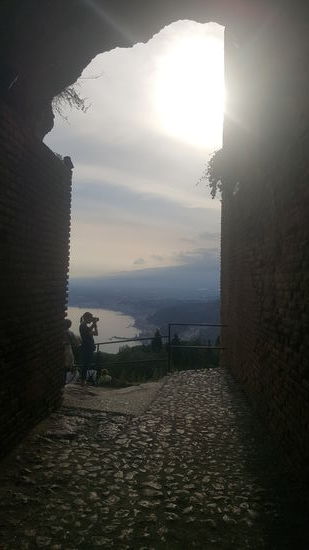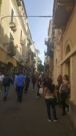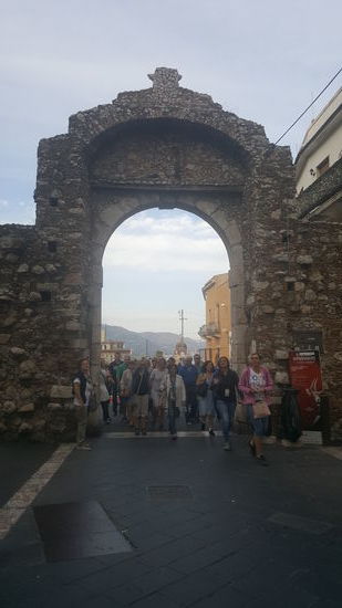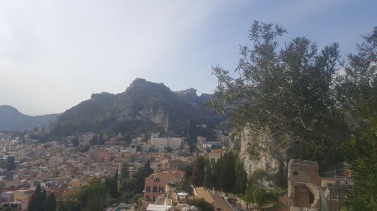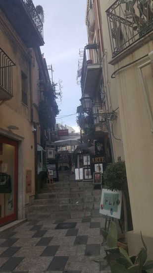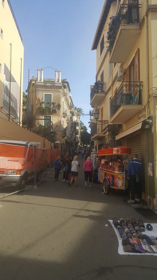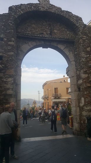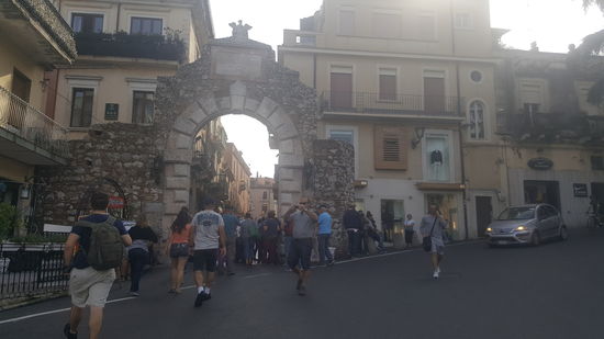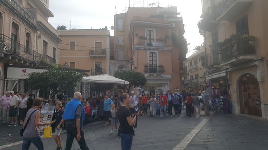 Taormina ist ein sehr voller Touristenort. Menschenmassen quälen sich durch die engen Gassen. Wir fahren und fahren um einen PArkplatz zu finden, aber nix zu machen. Es geht steil bergan zum Zentrum.