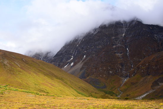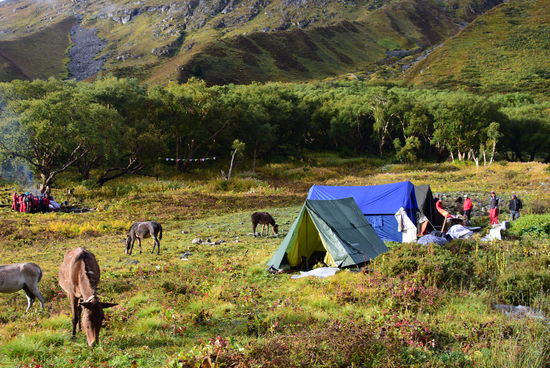Nach einer mittelmäßigen Nacht überlegt, ob ich mir die 1000 Höhenmeter antue oder, ob ich gleich umdrehe. Ich war zum ersten Mal froh, dass es zum Frühstück Porridge (halbwegs magenfreundlich) gab. Bin am Ende der Gruppe gegangen. Morgens ging es die ersten 3 Stunden ordentlich steil bergauf bevor sich das Flußtal zum Mittag weitete und es die letzten Meter relativ flach bis zum Mittagessen verlief. Leider hat es heute (inklusive Mittagspause) den ganzen Tag geregnet und es war doch recht ungemütlich. War beim Mittagessen nur knapp 15 Minuten hinter den letzten der Gruppe und nach dem Mittagessen (relativ flach, nur einmal etwas steiler zur Hochebene) bin ivh mit einem Teil der Gruppe gelaufen. Grünes Licht. Die Tour kann weiter gehen. Heute ist die erste Übernachtung über 4000m und morgen kommt der erste Pass.