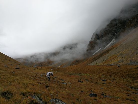 Heute wird es ein langer Tag. Aus diesem Grund gibt es bereits um 5:30 Uhr unseren Morning Tea ans Zelt. Um 7:00 Uhr geht es dann los. Der Aufstieg zum Pass war am Anfang noch relativ flach wurde dann immer steiler. Leider gab es auch heute wieder Nebel und Regen. Kurz vor dem Pass habe wir Mittagspause mit Tee und Nudelsuppe gemacht (leider ohne Sonne). Danach ging es über Geröll im Nebel zum 5050m hohen Pass. Mein erster 5000er!