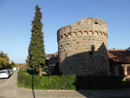 Nebenan Teil der alten Stadtmauer links vom Anwesen, mit Schießscharten und offenem Wehrgang.