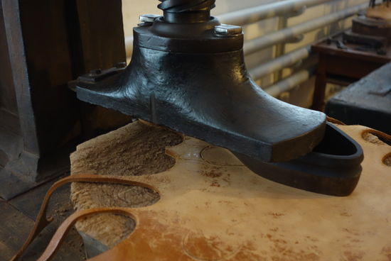 komplett funktionierende technische Anlage zur Schuhproduktion, angetrieben durch eine Transmission.