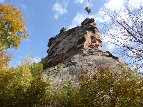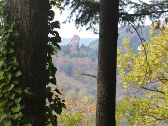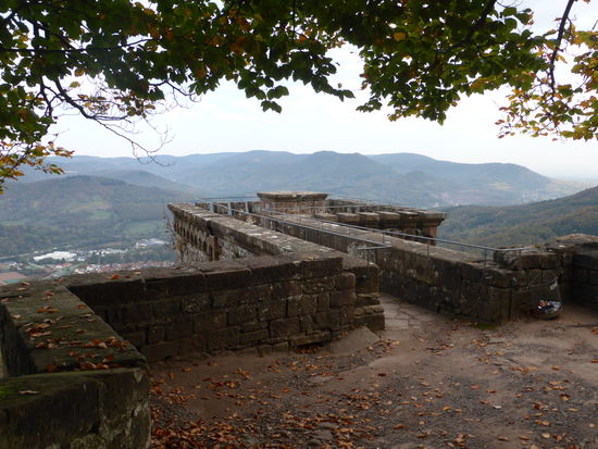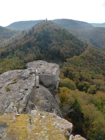 Die Höhenburg im pfälzischen Nordteil des Wasgaus auf der Kuppe des 494 m hohen Sonnenbergs steht auf einem dreifach gespaltenen Buntsandsteinfelsen, der 145 m lang, 40 m breit und 50 m hoch ist. Von dieser steinernen Basis stammt auch der Name der Burg, der „dreifacher Fels“ bedeutet. Beim Sonnenberg handelt es sich um einen der typischen oben abgerundeten Felsenberge des Wasgaus, der vom Südteil des Pfälzerwalds und dem Nordteil der Vogesen gebildet wird. /aus: Wikipedia)
