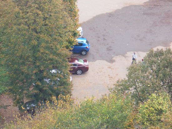 Oberhalb des Ortes liegt der Parkplatz, der heute schon früh - d.h. vor Öffnung des Kiosks - gut frequentiert ist. Auf einer Tafel steht gechriben, dass man ein Ticket für den Parkplatz am Kiosk erstehen soll. Aber das geht ja z.Zt. nicht. - Außerdem schockt der gezeigt Preis: 50 €. Nach Rückkehr ist der Kisok geöffnet und Betreiber hat die Tafel wieder korrigiert: und vor die 50 eine Eins mit Komma gesetzt.