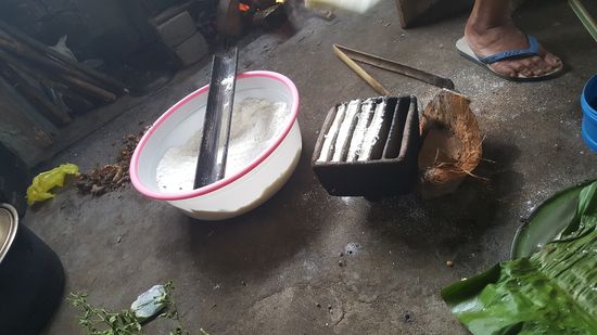 Sie macht kleine Sagokuchen- bzw Sagobrot welches sie auf dem Markt verkaufen will. Ihre eine Tochter studiert in Manado und wird von ihr so finanziell unterstützt.