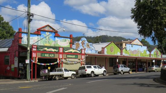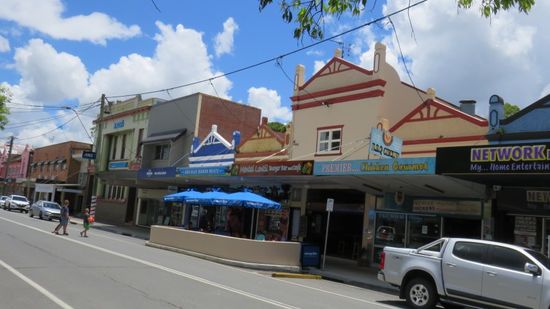 Wir fahren nach Murwillumbah, erfahren dort in der Tourist Info, dass das Rainforest Center, das wir eigentlich besuchen wollten, dem letzten Hochwasser (40 ft, also gut 13m über dem normalen Flusspegel) zum Opfer gefallen ist. Wir begnügen uns damit ein paar der Jugendstil-Gebäude zu besichtigen,