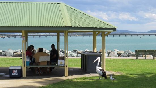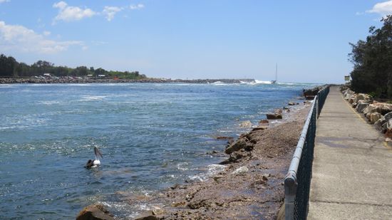 vorbei am riesigen Breaker (Wellenbrecher) bei Harrington zum Strand nach Tuncurry, wo dieser Pelikan Betteln wohl auch einfacher findet als Arbeiten, sich selbst ein paar Fischen zu fangen.