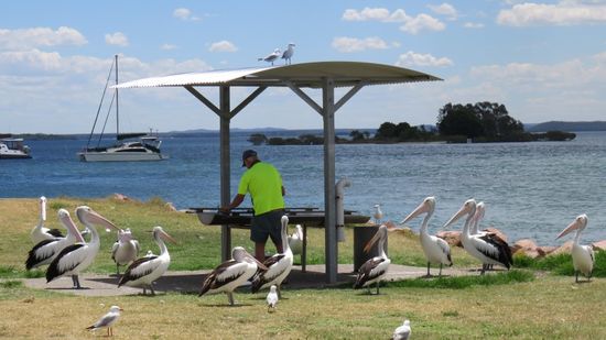 In Hawks Nest starren wir in der ach so heftig beworbenen ‚Koala Reserve‘ verzweifelt hoch in die Bäume, bis uns ein Anlieger erklärt dass es hier eigentlich (fast?) keine Koalas mehr gibt,…Wir durchqueren das gesichtslose Tea Garden, schauen in Port Stephens draussen am Soldiers Point einer weiteren ‚Fischfiletierungs-Pelikan Fütterung‘ zu,