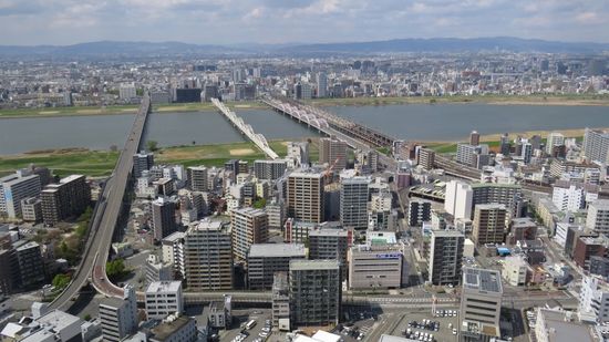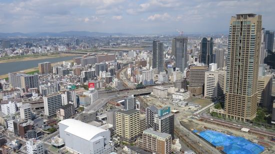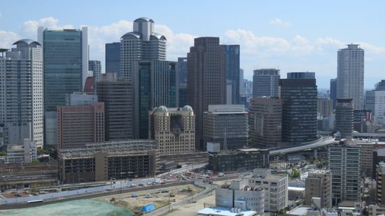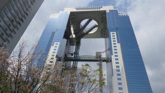 vom selben Architekten wie der Bahnhof von Kyoto entworfen, hoch in den Sky Garden (E=1000 Yen pP), von da runter zum Zentralbahnhof von Osaka, der Osaka Station geschaut, von modernen Gebäuden umzingelt,