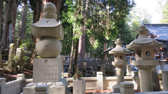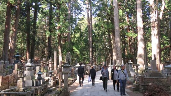 und weiter im Osten Okunoin, der Jahrhunderte alte Friedhof mit seinen Steingräbern, von alten Zederbaeumen überwachsen.