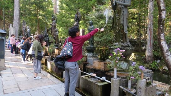 die sowohl von Kaisern als auch von Normal-Sterblichen gestiftet wurden geht es zurück, am Mizumuke Jizo vorbei an dem Budhha Statuen mit Wasser beworfen werden um Verstorbenen den weiteren Weg zu erleichtern.
