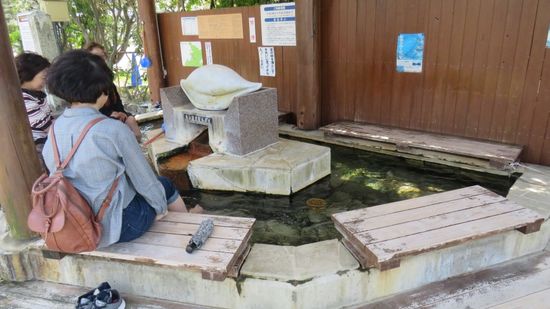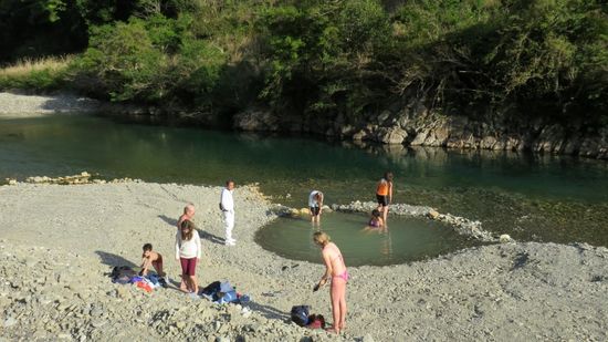 Nahebei besichtigen wir noch diesen Outdoor Onsen, ein Bachbett, durch dessen Kies heisses Wasser nach oben dringt, im Winter werden hier per Bulldozer ganze Becken ausgehoben wo auch der Spitzname: „der 1.000 Personen fassende Onsen“ herrührt,