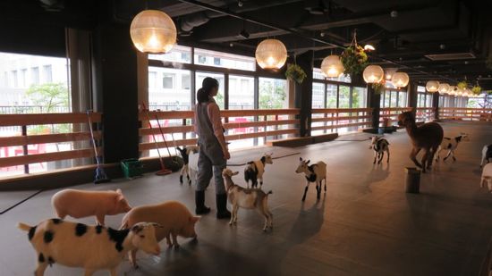 Den Rest des Tages verbringen wir im Umfeld des Bahnhofs, gehen zum Pasona Building, dem ‚Kreativitätstempel‘, einst ein von aussen völlig eingegrüntes Gebäude mit Bäumen, die aus der Hausfassade wuchsen, dieser Teil existiert leider nicht mehr, aber die Auberginen und anderes Gemüse, das in der Kantine von der Decke wächst ist immer noch vorhanden und die ‚kreativitätsanregende‘ Mini-Farm mit Schweinen, Ziegen, einem Alpaka und den drei warum auch immer Eulen??!!?? im 13. Stock ist auch immer noch da.