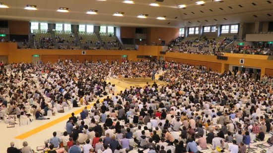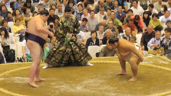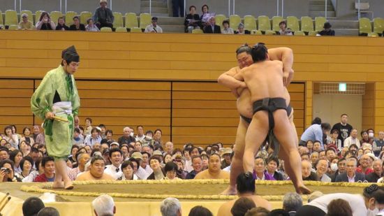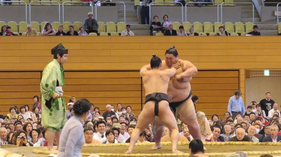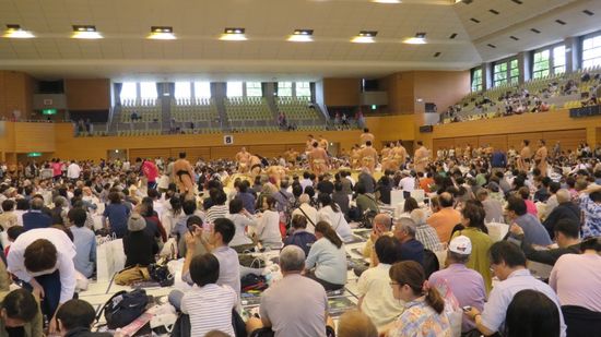 Heute steht Sumo Ringen auf dem Programm, die wohl japanischte aller japanischen Sportarten, vom Unterhaltungswert wohl am besten mit dem amerikanischen Baseball vergleichbar. Etwa alle 2 Monate wird abwechselnd in Osaka, Tokyo und Nagoya ein 14 tägiges Sumo Tournier abgehalten, wobei deren Termine aber überhaupt nicht in unseren Reiseplan passten. Dazu gibt es zusätzlich noch die Sumo Tour, 28 Tage lang werden Wettkämpfe in jeweils einer anderen Stadt im Umfeld von Tokyo abgehalten – und wie es der Zufall so will findet heute der letzte dieser Serie im nur 20km entfernten Koshigaya statt. In der dortigen Tourist Info erfahren wir, in welcher Sporthalle dieses Event stattfindet – und dass noch Eintrittskarten verfügbar sind. Wir leisten uns 2 Tickets im näheren Umfeld des Rings (JPY 21.000), bekommen dafür ca. ½ qm auf einer dieser bodenbedeckenden Reisstrohmatten zugewiesen,