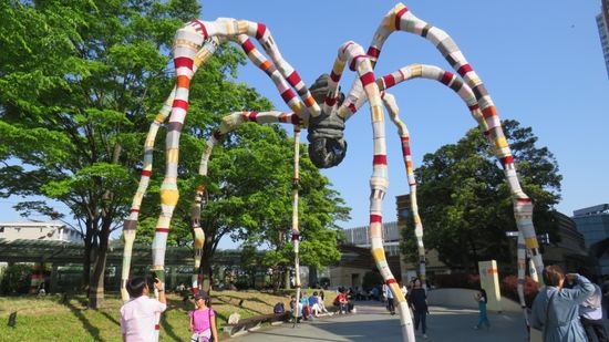 und seiner riesigen Spinne, deren Beine derzeit ein Strickkünstler im ‚Christo Stil‘ mit Wollpullovern überzogen hat.