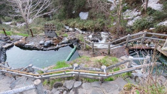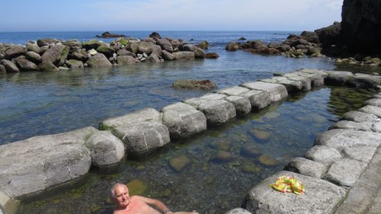 wo der Fukiage Roten-no-yu = Blowing Air Onsen bereits auf uns wartet. Zwei Heisswasserbecken, droben am Berg,