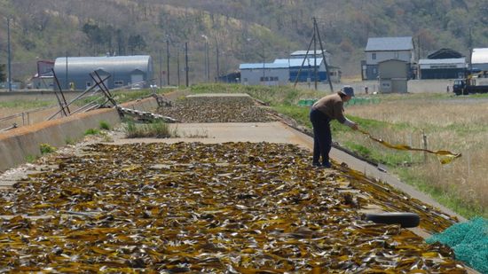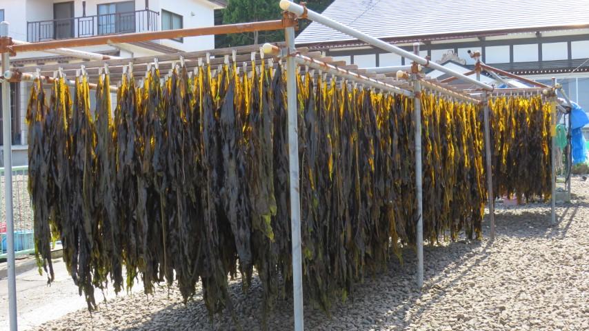 hat seine Badezeiten in Abhängigkeit von den Gezeiten, d.h. heute u.a. von 11h -13h. Wir geniessen das Leben in der warmen Brühe, freuen uns über jede Welle die über den Rand schwappt und kurze Abkühlung bringt und fahren nach Badeschluss weiter, grob Richtung Norden – Nord-Osten. Kommen dabei durch zahlreiche Fischerdörfer in denen Kelp = großblättriger Seetang zum Trocknen auf der Wäscheleine -