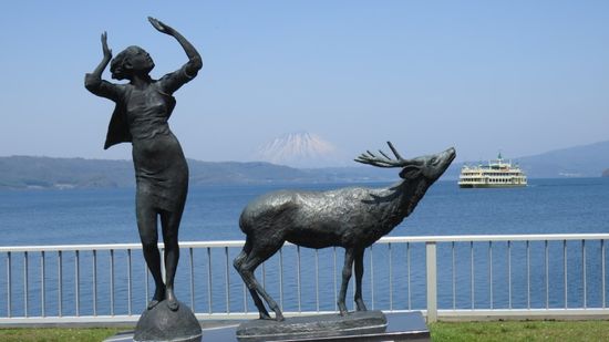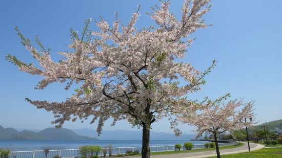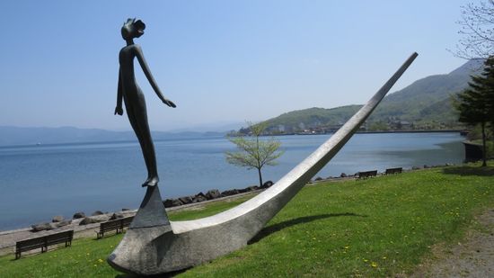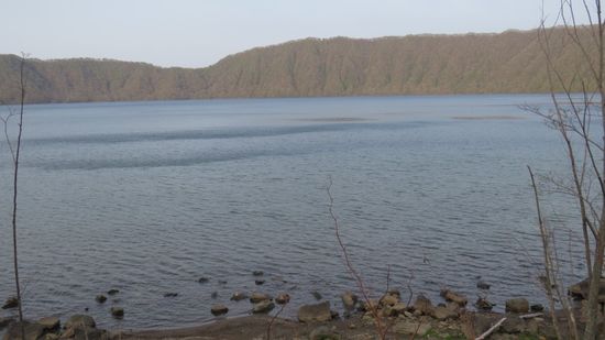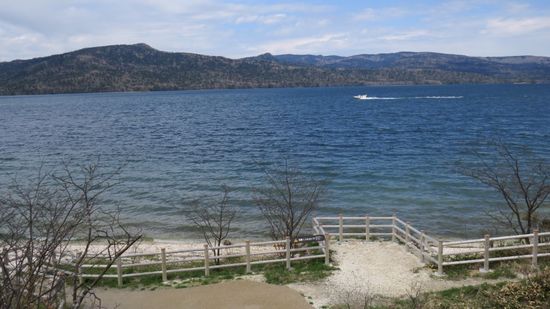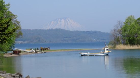 Wir wandern den Lake Toya entlang, einem Kratersee mit gut 50km Umfang, sehen im Hintergrund den Yotei-zan, den kleinen Bruder des Mt. Fuji