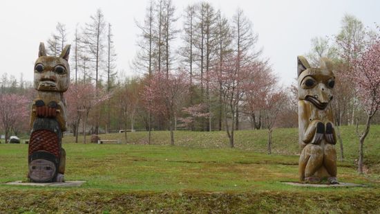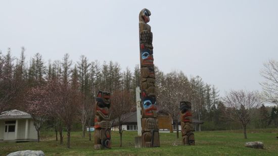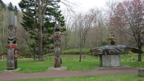 zum Sangai-taki Park, wo von solchen Totempfählen, Ergebnis einer Partnerschaft mit einer Gemeinde in BC, Canada,