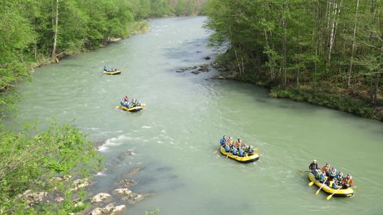 Wir fahren halt ‘aussen rum’, bewundern diese Wildwasserfahrer die sich mutig einen Fluss der Stufe 1 – 2 runter schippern lassen,