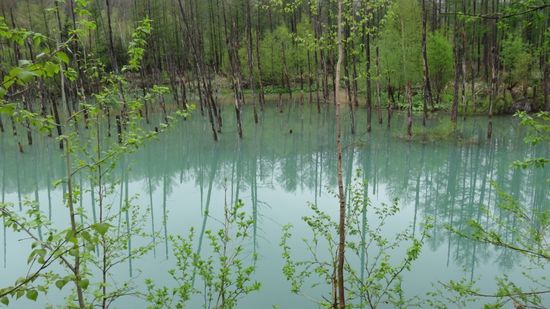 Am nächsten Morgen erleben wir mal wieder ‘typisches Bergwetter’, 3 Jahreszeiten auf einmal. Beim Aufwachen Sonnenschein, zum Kaffee dann Starkregen, der sich zu einen Nieselregen abschwächt hat, als wir dann endlich zu unserem Freiluft-Onsen Besuch im Fukiage Roten-no-yu aufbrechen. 2 Stunden später sind wir durchgeweicht, die Sonne scheint und wir fahren runter ins Tal nach Biei wo wir auf den in keinem Führer bisher vermerkten Blue Pond stossen.
