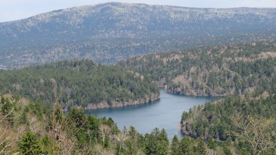 Von einem Aussichtspunk an der Strasse können wir einen kurzen Blick durch die Bäume auf den Lake Panketo werfen, der angeblich die Form der Insel Hokkaido hat, auf der wir uns derzeit befinden –