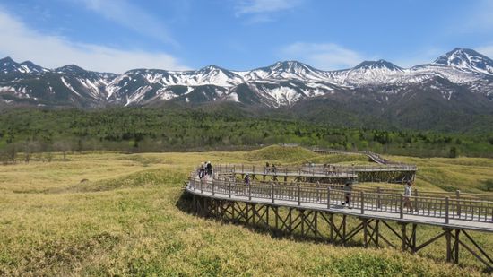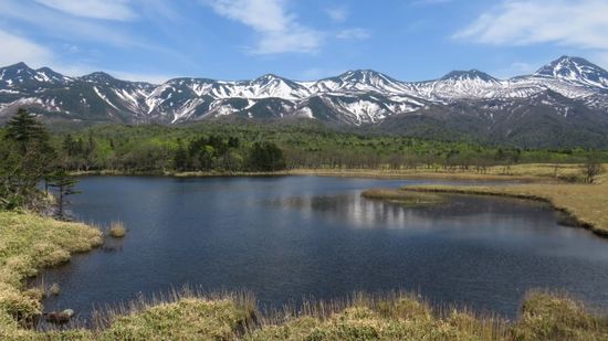 geht es zu Wandergebiet bei den Fünf Seen. Nachdem die JPY 500 Parkgebühr entlöhnt sind, kann man(n) hier, mit der Shiretoko Mountain Range im Hintergrund,