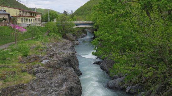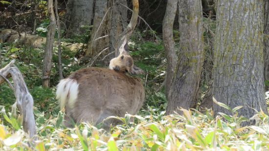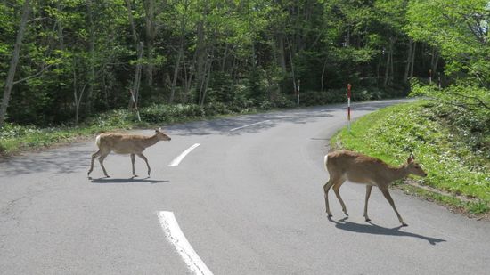 oder sich für weitere JPY 5.000 (=$50) von einem in Bärenabwehr ausgebildeten und mit einer Dose Bär-Spray bewaffneten Guide in ca. 40 Minuten um die restlichen 4 Seen führen lassen (Rechenaufgabe: 20 Touristen zu je US$50 für 40 Minuten Spaziergang ergibt einen Stundenlohn von xxx?). Der weiter von uns geplante Weg zum Kamuiwakka-yu-no-taki Wasserfall und dem daneben liegenden Onsen ist wegen kalendarischer Winterpause immer noch gesperrt, die Strasse wäre schneefrei, trocken, aber St. Bürokratz darf eben nichts annehmen, nicht mal Vernunft. Fahren wir eben zurück, stören ein paar Hirsche beim überqueren der Strasse