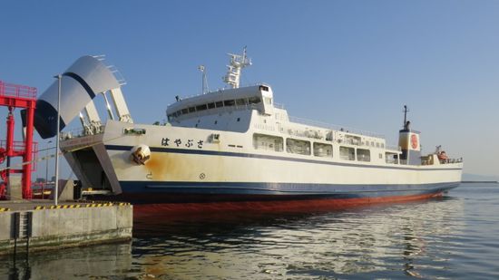 die bei ca. 160km Wegstrecke und daher auch doppelter Fahrzeit im Vergleich zum Herweg über Oma doch tatsächlich gute JPY 2.000 günstiger ist. Beim Beladen wird uns der Grund klar, gerade mal 5 PKW wollen heute mit, das recht neue Schiff ist randvoll mit LKW’s, hier wird offensichtlich mit den Dicken Brummern so viel Geld verdient, dass sich zwei parallele Fährlinien mit jeweils bis zu 8 Überfahrten pro Tag zu rechnen scheinen, während Oma ja gerade zwei Mal am Tag bedient wird.