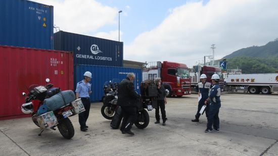 bevor wir um 11:00 einen Termin im Zollbüro bekommen, hier werden Passnummer mit Gesicht und eingereichten Unterlagen verglichen – und dann hat der Zoll erst mal Mittagspause, um 13:00 soll es mit der Freigabe der Fahrzeuge weitergehen, gegen 13:20 wird dann das erste Motorrad dem Besitzer übergeben