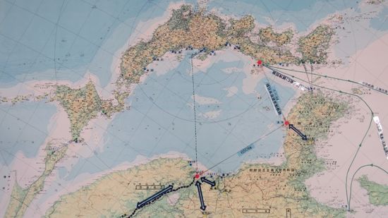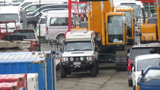 In Sakaiminato 14:00, eine japanisch höfliche und oberflächliche Inspektion durch den Zoll, das CdP wird ausgestempelt, wir bringen die letzten Sicherheitsschlösser an.