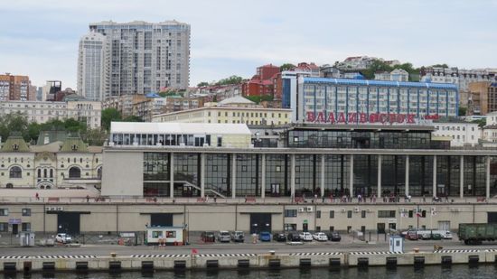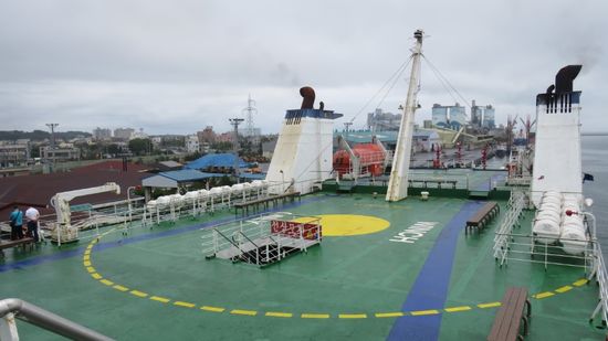 Um 12:00 sind wir wieder zurück im Hafen, müssen uns erneut einchecken, bekommen so auch eine andere Kabine zugewiesen, gleicher Typ, auch wieder zur Alleinbenutzung, das Behalten der zuletzt benutzen Kabine war wegen japanisch-koreanisch-russischer Computerokratie oder warum auch immer unmöglich. Um 14:00 geht es weiter,