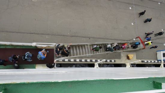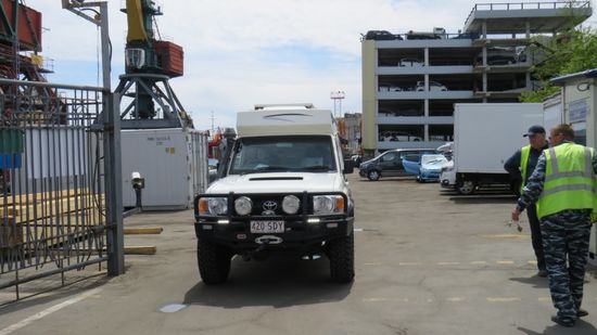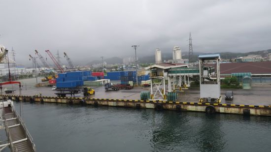 Am nächsten Morgen werden wir um 9:15 vom Hotel abgeholt und wieder runter zum Terminal gefahren, die Fähre wird trotz Feiertag immer noch entladen