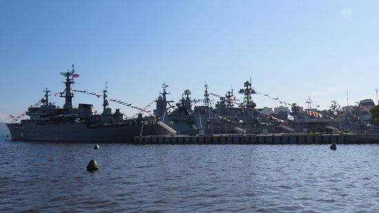 vorbei an einigen aktiven Schiffe der Marine, die heute wegen dem Feiertag über die Toppen beflaggt sind