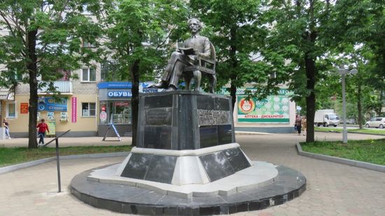 und stehen dann vor den Sholom-Aleykhema gewidmeten Denkmal, in Würdigung seiner Geschichten aus der Stadt, der Umgebung, die dann um 1970?? als Grundlage für das Musical Anatevka / Fiddler on the Roof dienten. (Wenn ich einmal reich wär, larafididididei,…)